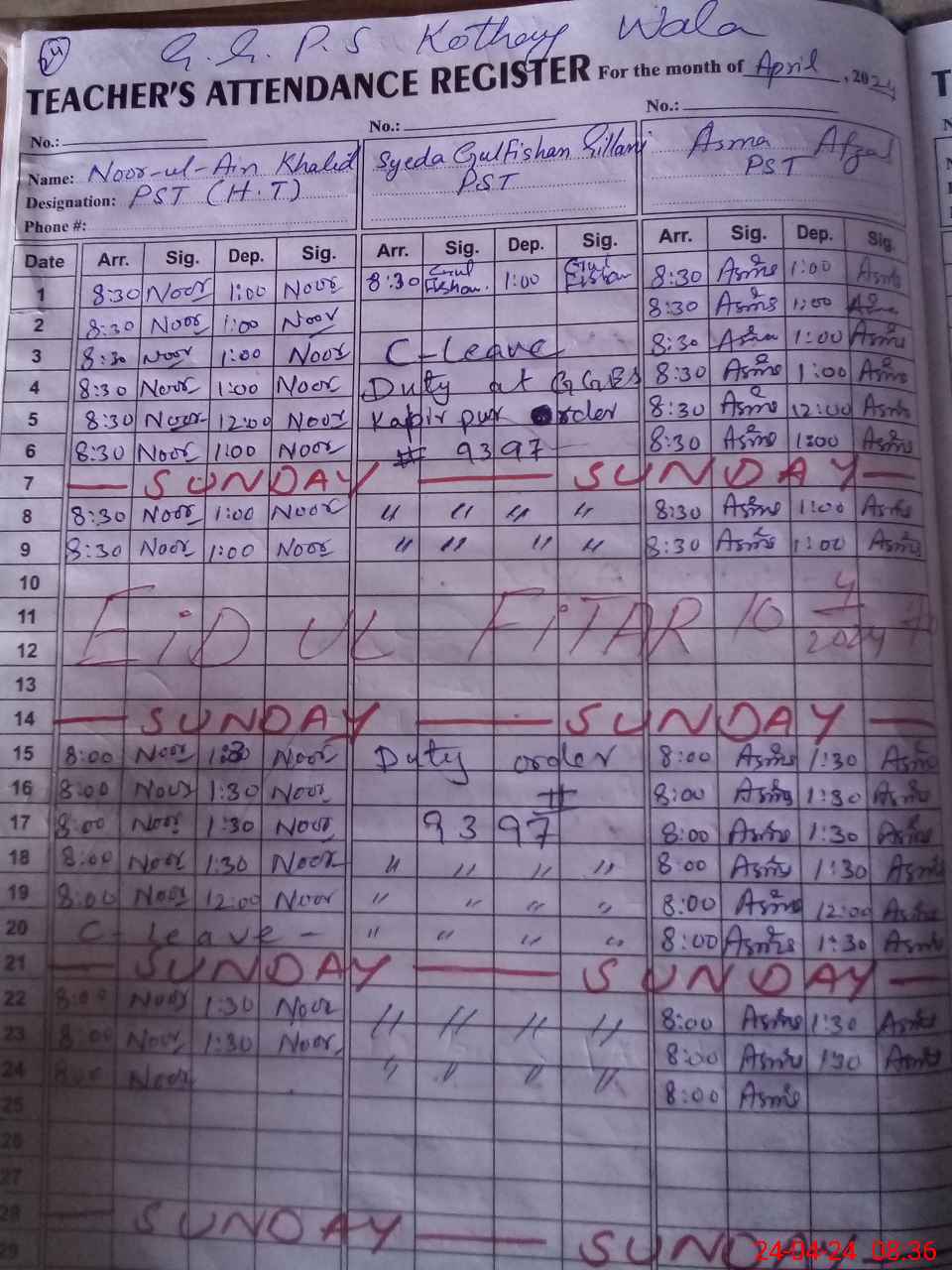 | CNIC | Full Name | Designation | R/C | Absence During Last Calender Month |