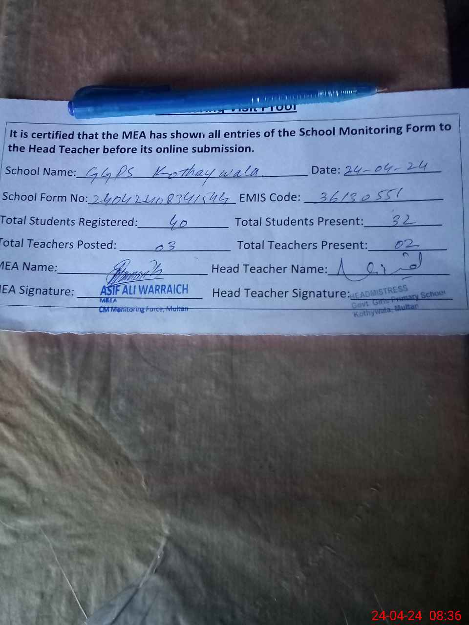 | Attendance Register | Head Teacher | MEA with School | Visit Proof |