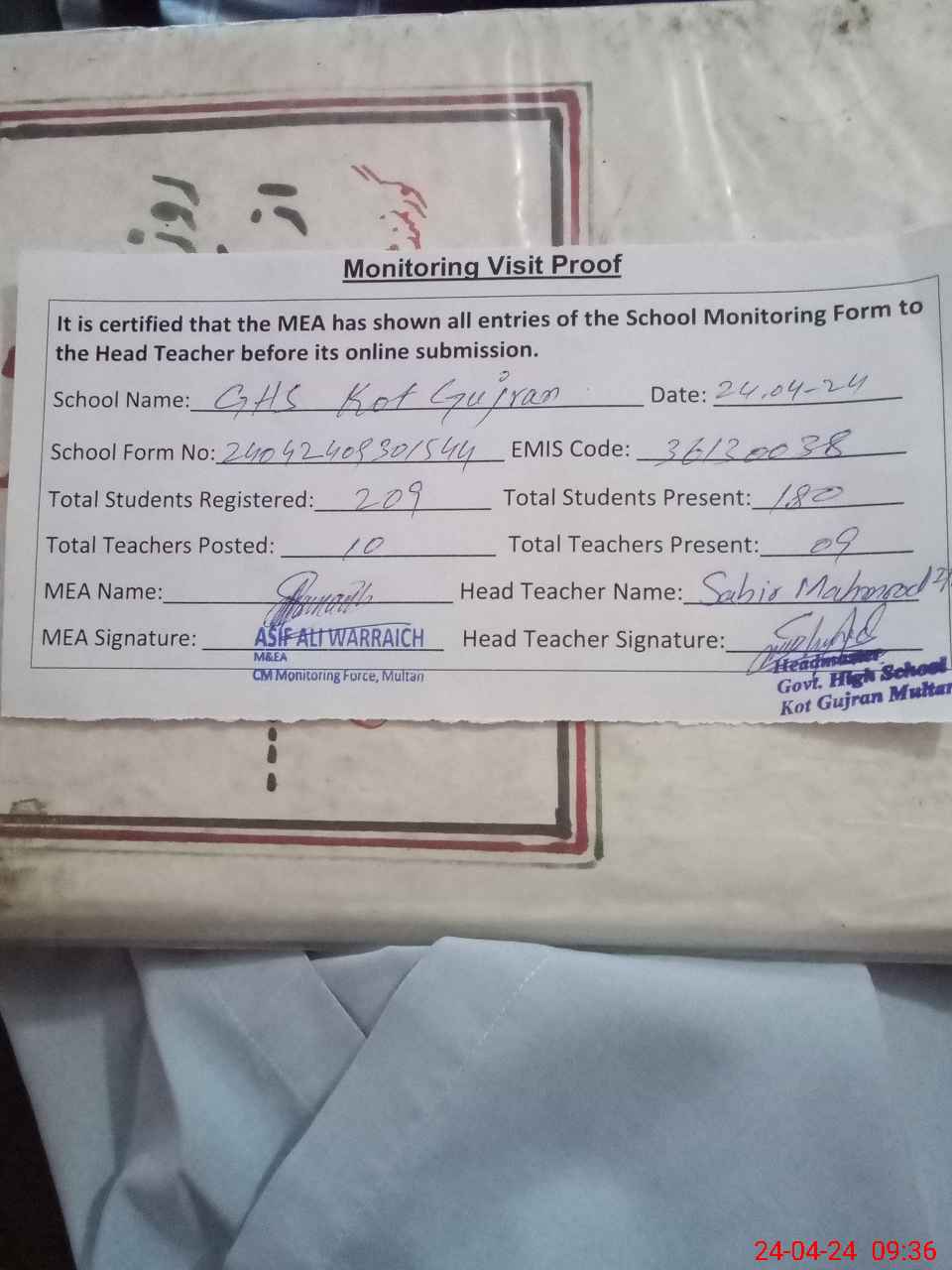 | EMIS Code: 36130038 | Name of School: GHS KOT GUJRAN MULTAN | |||
