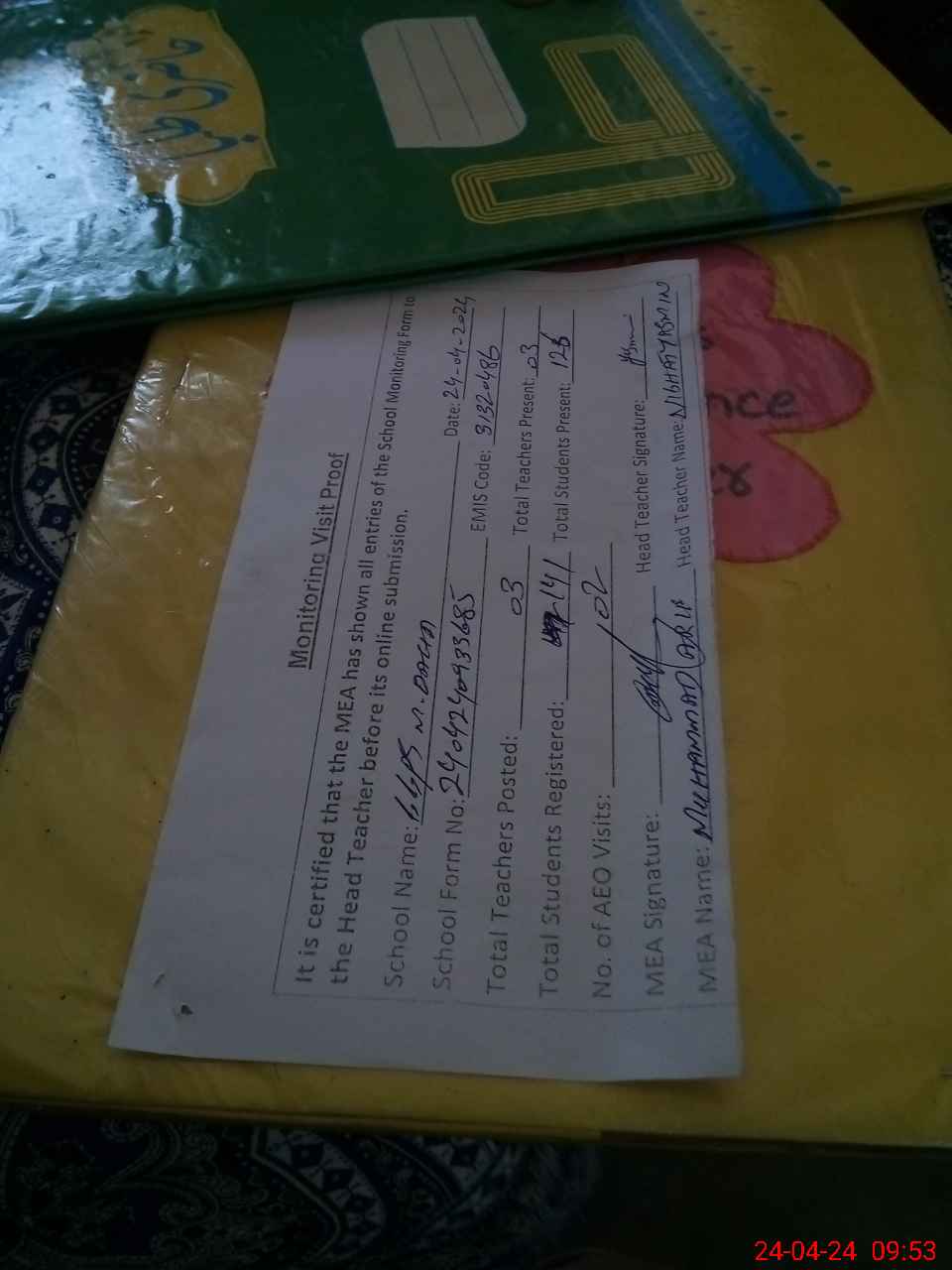 | Attendance Register | Head Teacher | MEA with School | Visit Proof |
