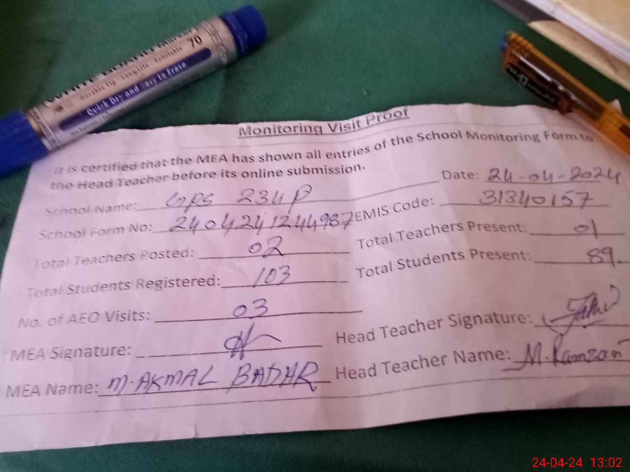 | EMIS Code: 31340157 | Name of School: GPS CHAK NO 234-P | |||