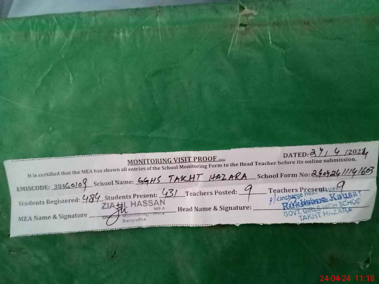 | EMIS Code: 38460109 | Name of School: GGHS TAKHT HAZARA | |||
