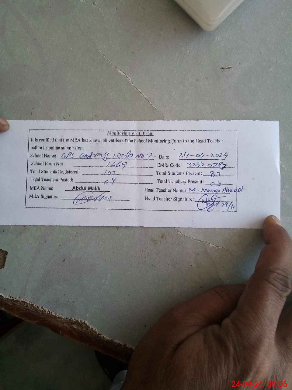 | Attendance Register | Head Teacher | MEA with School | Visit Proof |