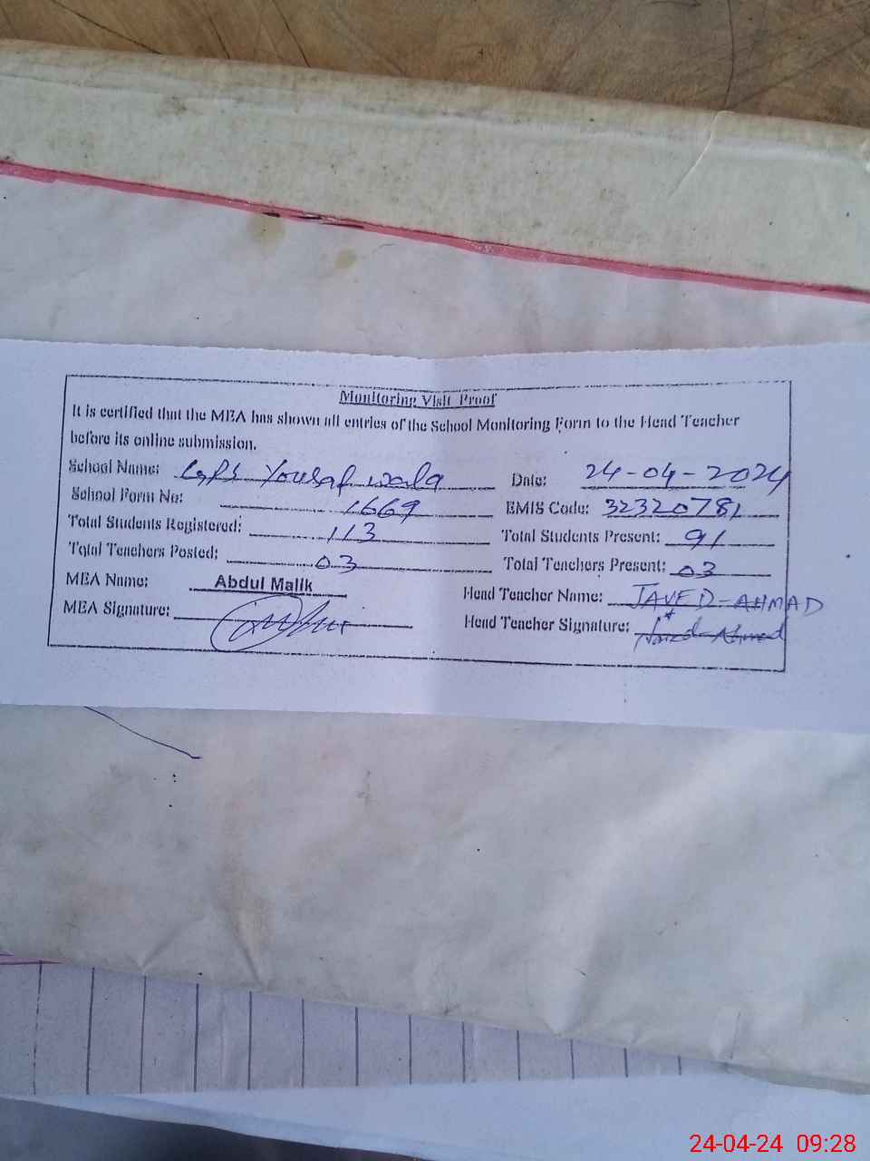 | EMIS Code: 32320781 | Name of School: GPS YOUSUF WALA | |||