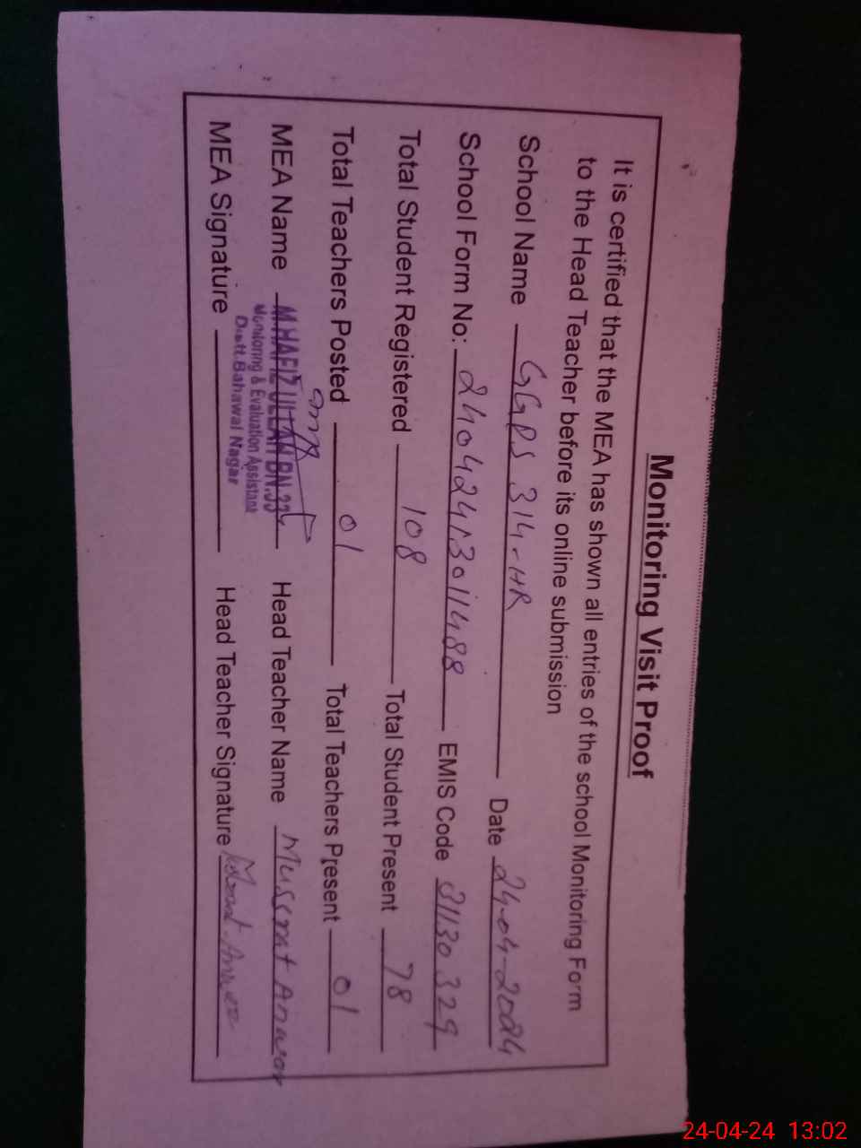 | Attendance Register | Head Teacher | MEA with School | Visit Proof |