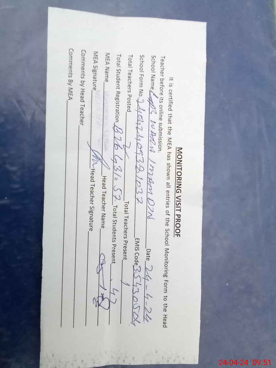 | Attendance Register | Head Teacher | MEA with School | Visit Proof |