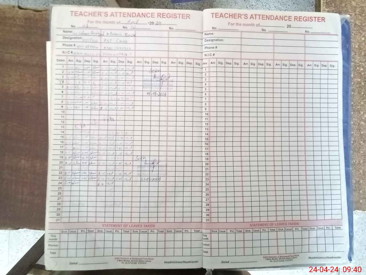 | Remarks (Use Separate Page if Required): Teacher shehzad Ahmed not present | |||||