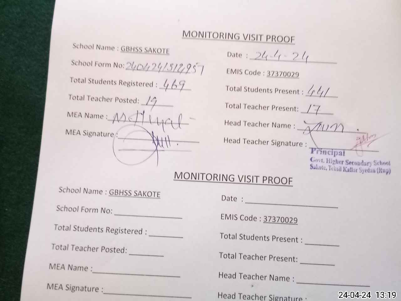 | Attendance Register | Head Teacher | MEA with School | Visit Proof |