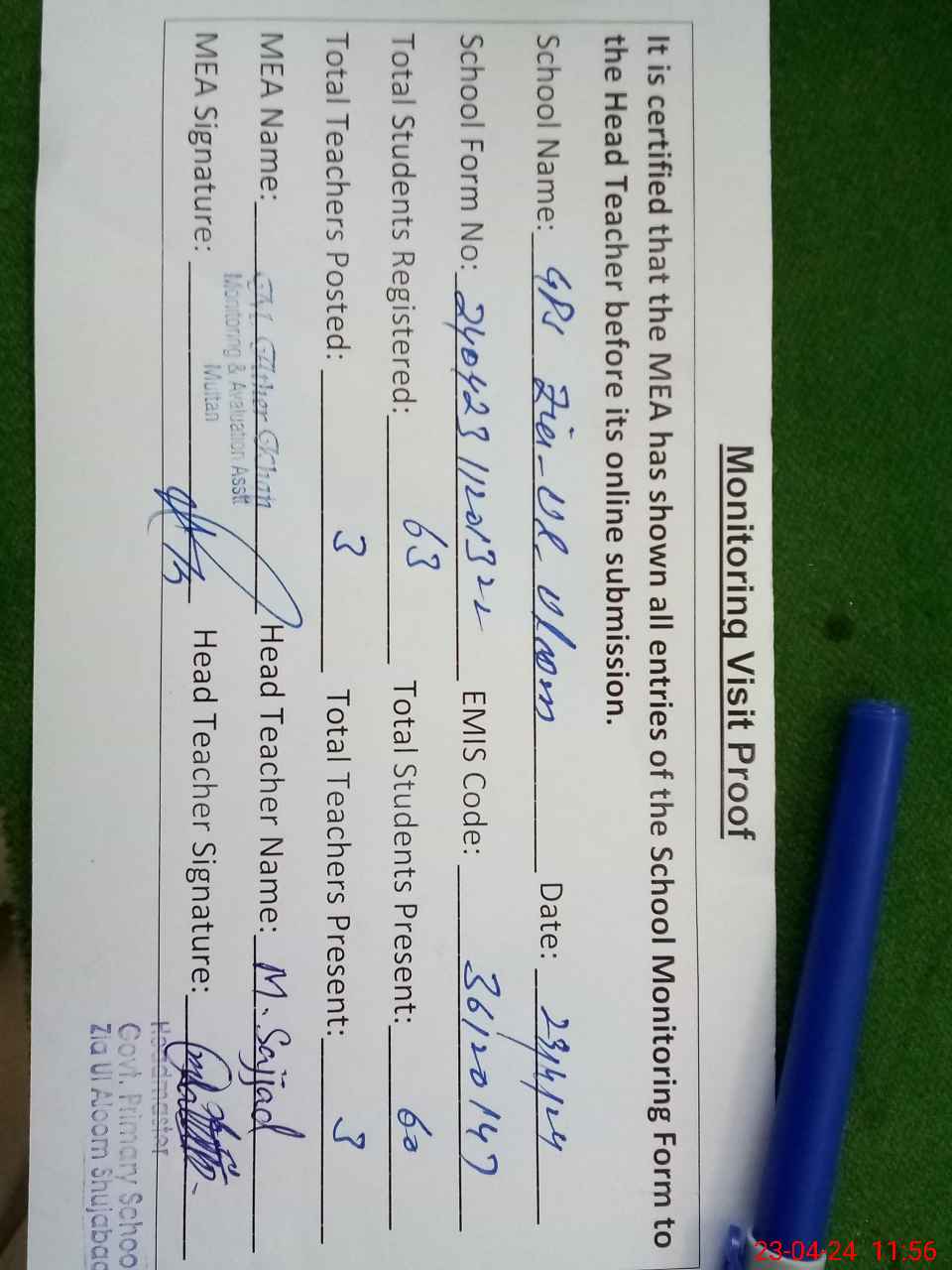 | Attendance Register | Head Teacher | MEA with School | Visit Proof |