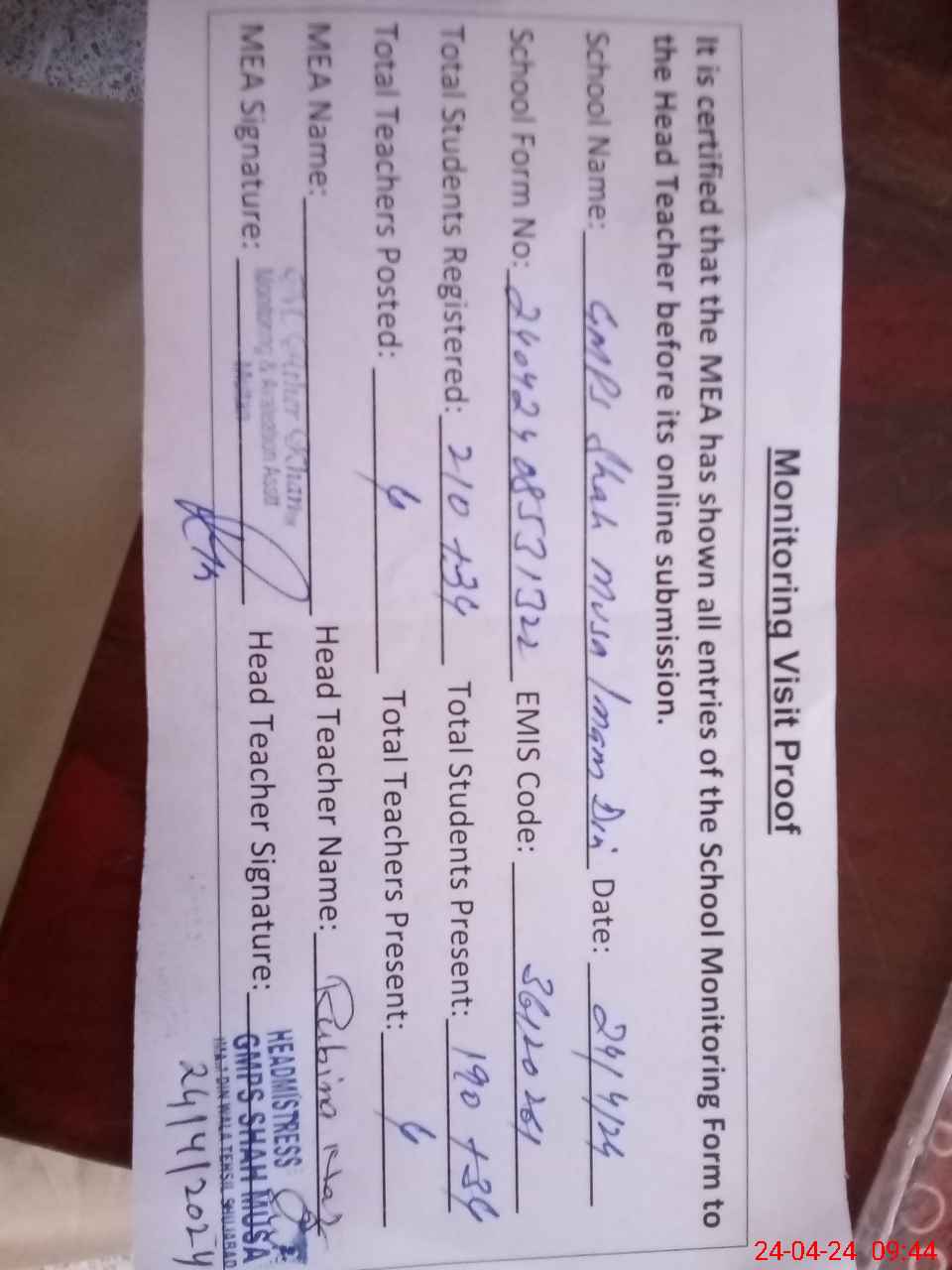 | Attendance Register | Head Teacher | MEA with School | Visit Proof |