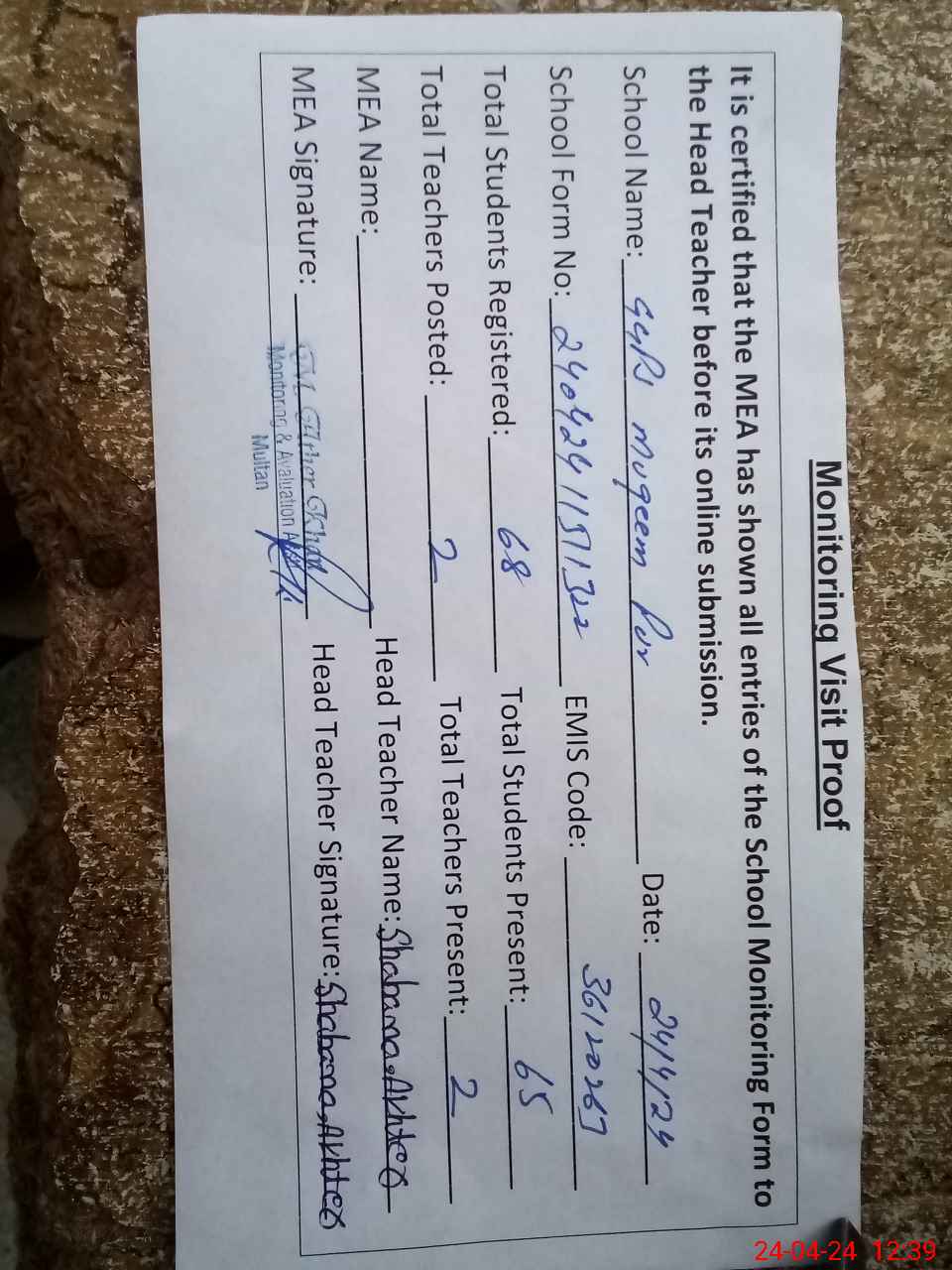 | Attendance Register | Head Teacher | MEA with School | Visit Proof |