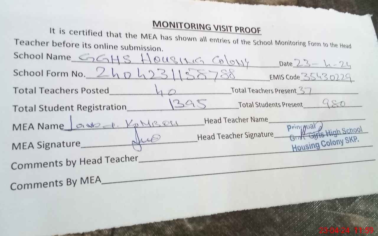 | Certified that this School was Inspected by the Undersigned MEA/DMO Today and the Information Stated Above is as Per Record. | |||||