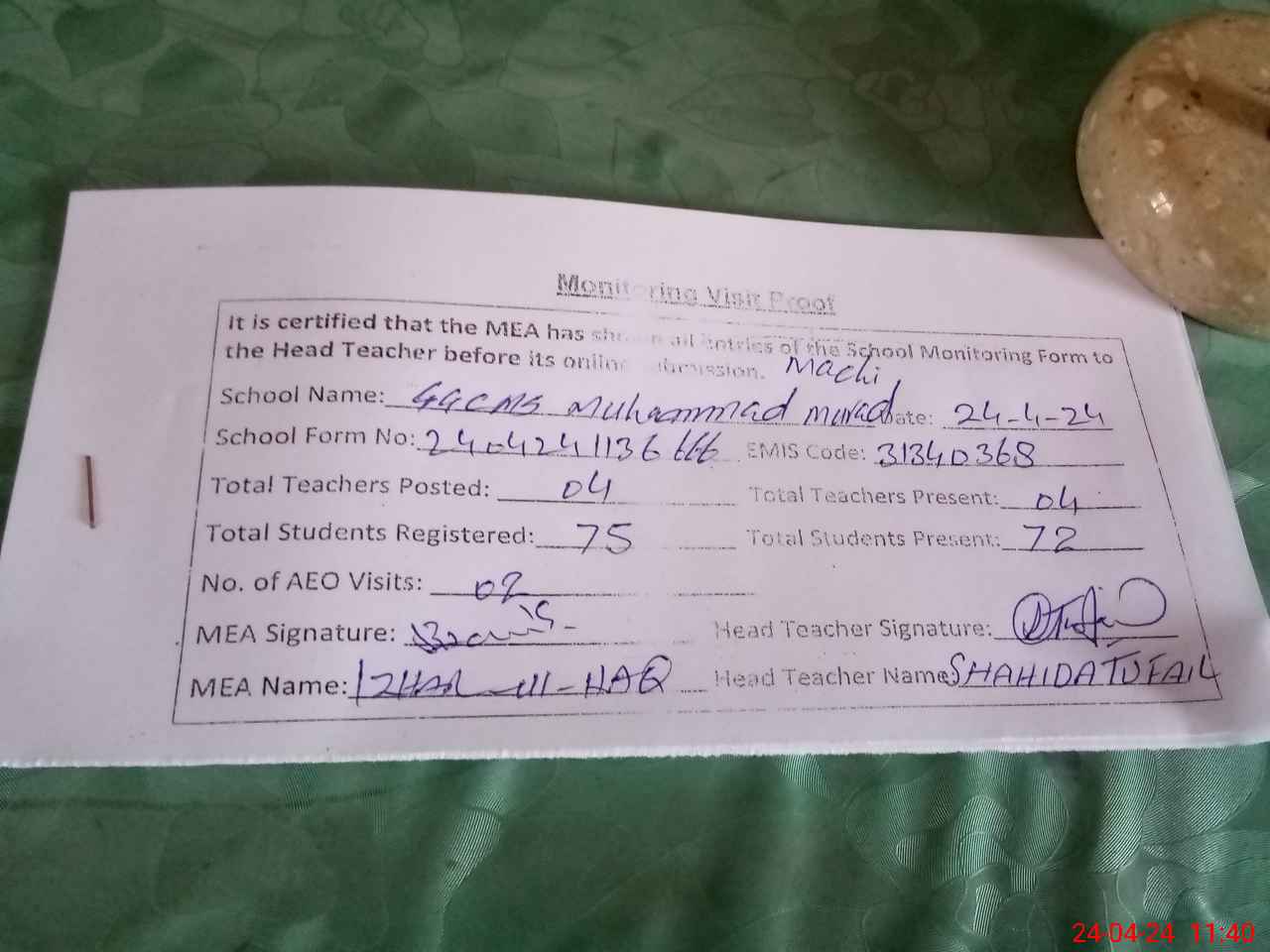 | Attendance Register | Head Teacher | MEA with School | Visit Proof |