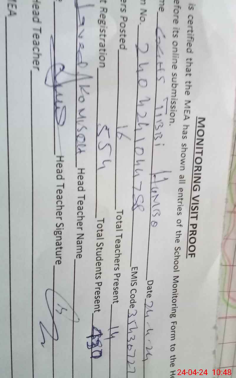 | Attendance Register | Head Teacher | MEA with School | Visit Proof |