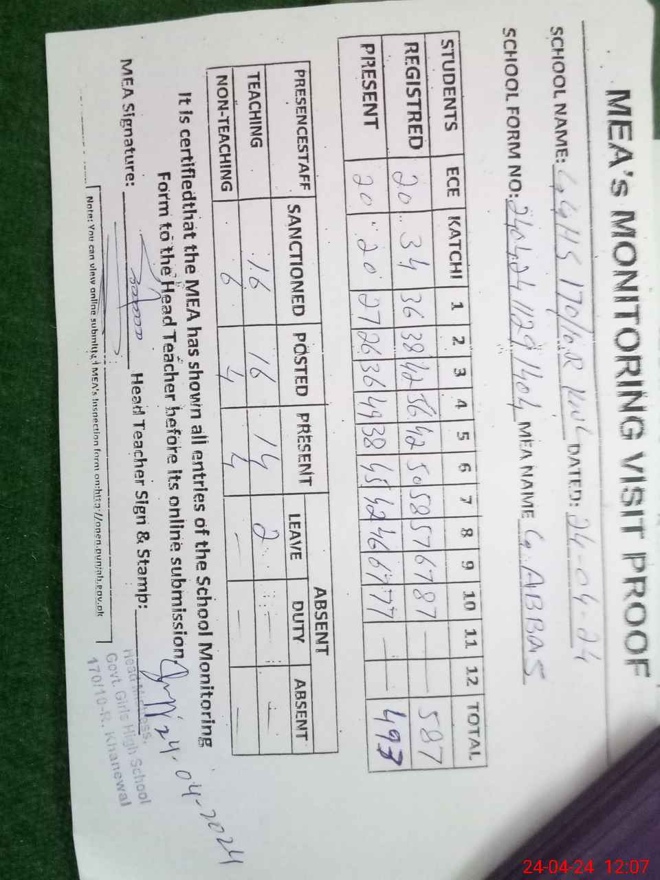 | Attendance Register | Head Teacher | MEA with School | Visit Proof |