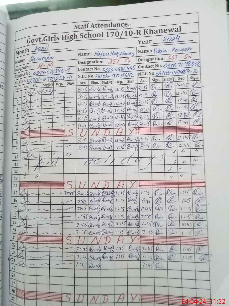 | CNIC | Full Name | Designation | R/C | Absence During Last Calender Month |