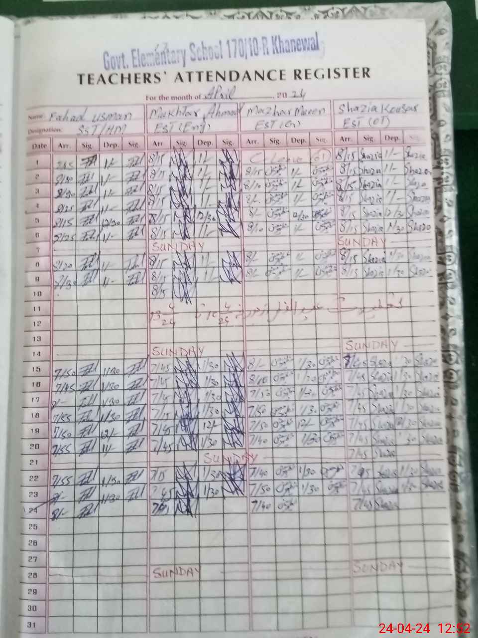 | CNIC | Full Name | Designation | R/C | Absence During Last Calender Month |