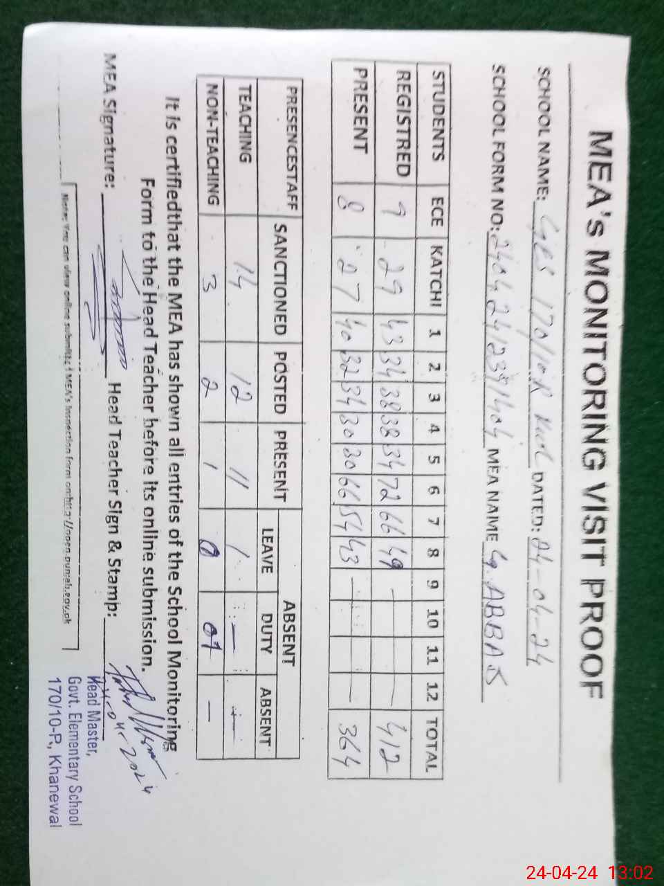 | Attendance Register | Head Teacher | MEA with School | Visit Proof |