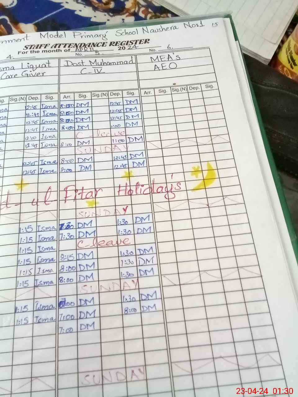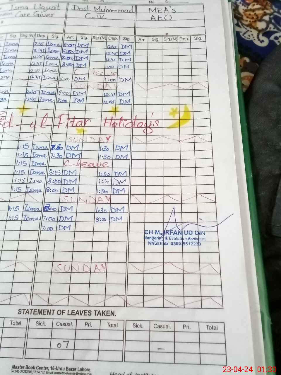 | CNIC | Full Name | Designation | R/C | Absence During Last Calender Month |