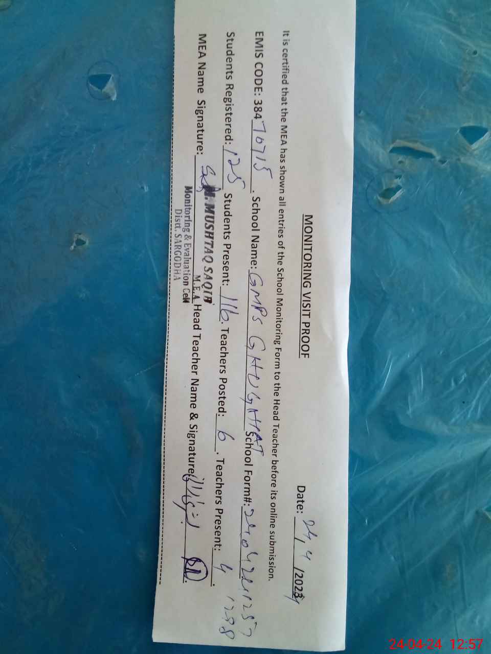 | Attendance Register | Head Teacher | MEA with School | Visit Proof |