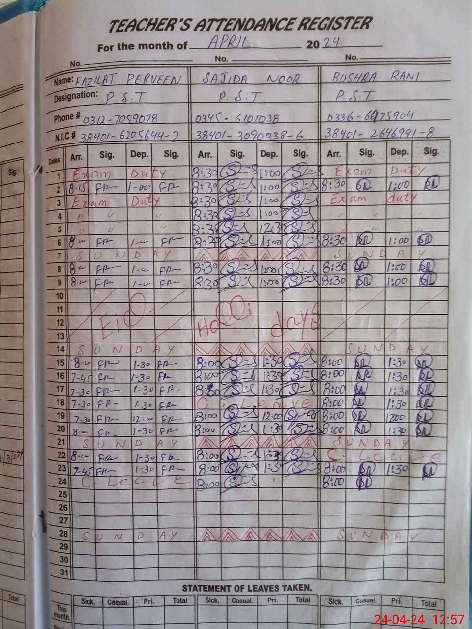 | CNIC | Full Name | Designation | R/C | Absence During Last Calender Month |