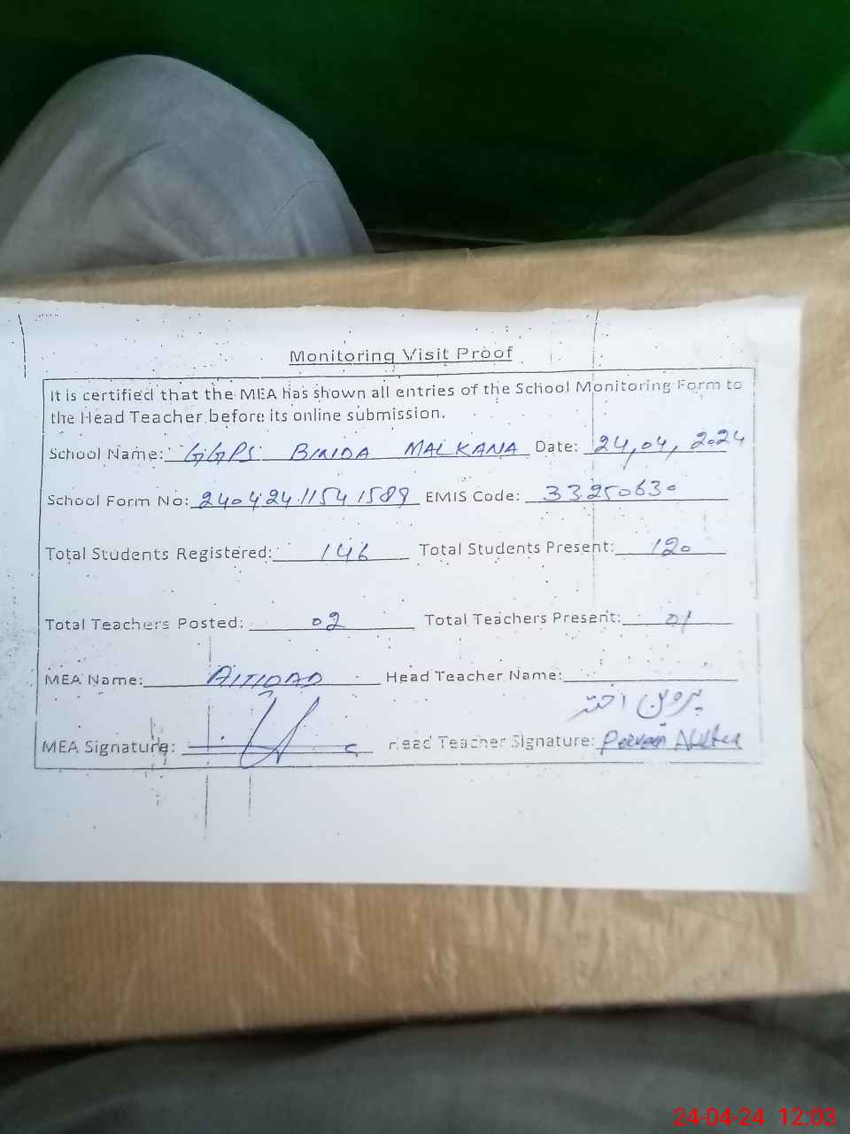 | EMIS Code: 33250630 | Name of School: GGPS BINDA MALKANA | |||