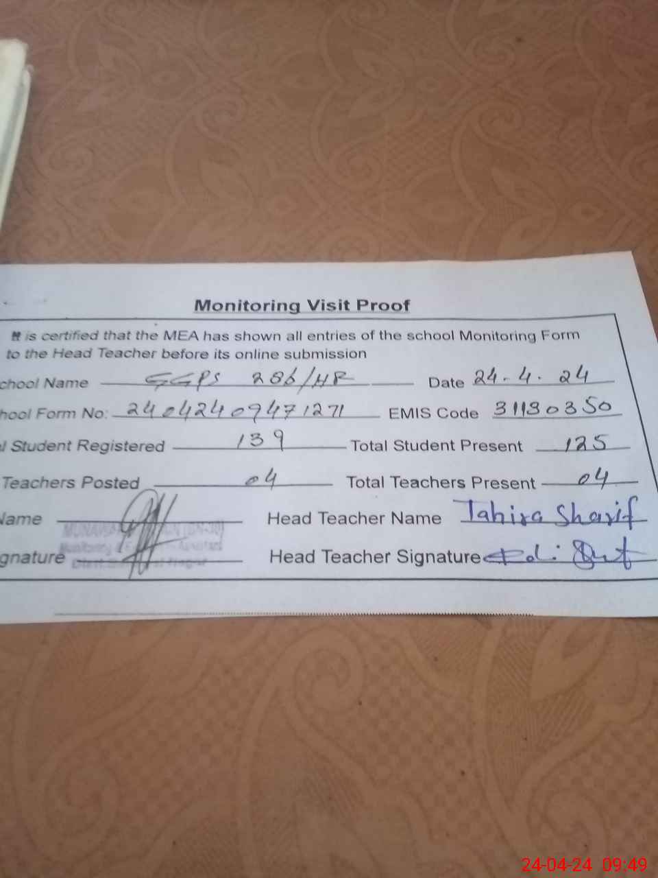 | EMIS Code: 31130350 | Name of School: GGPS CHAK NO 286 HR | |||