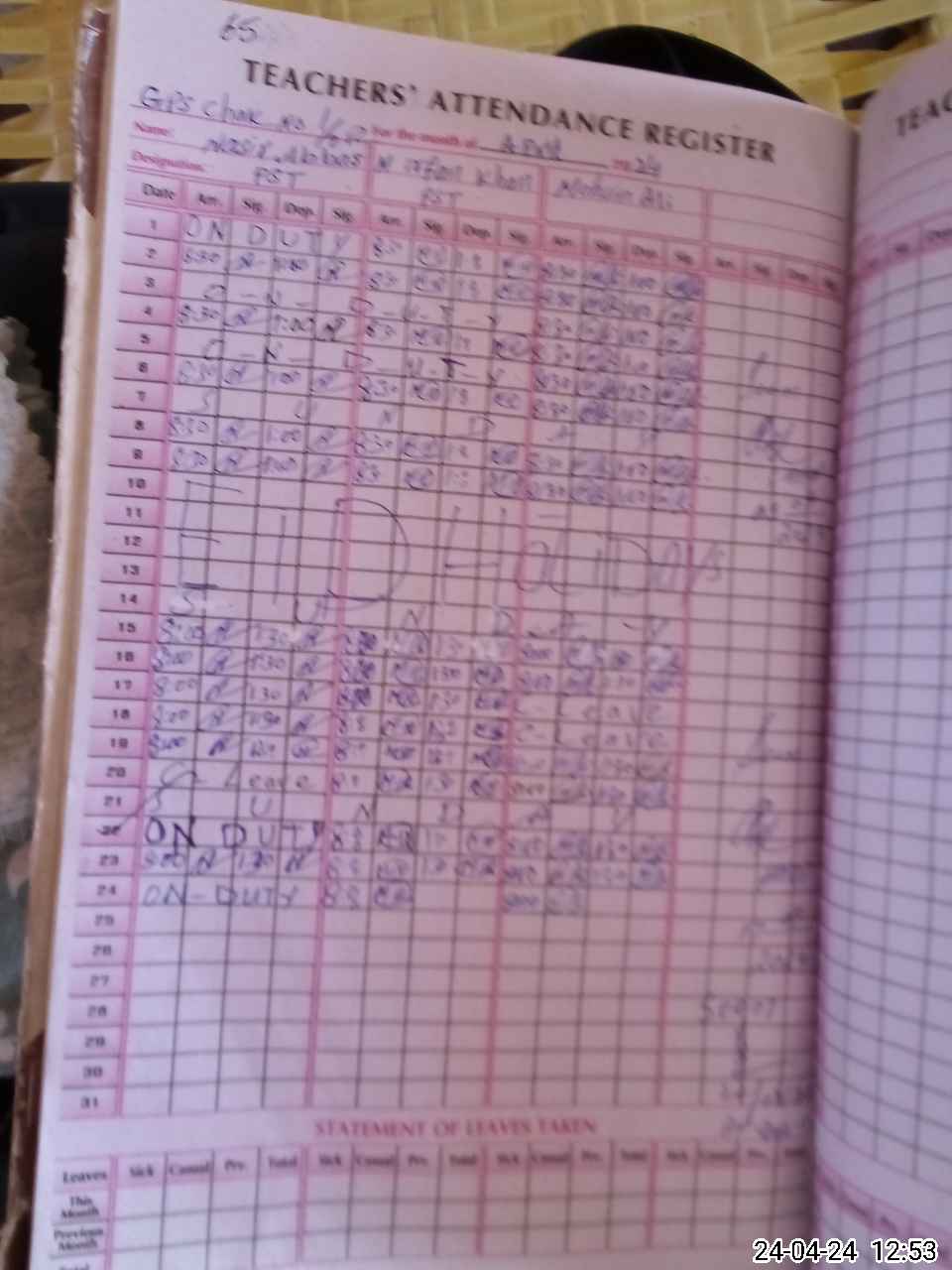 | Leave | Duty | Absent | Maternity | Medical | Ex- Pak |