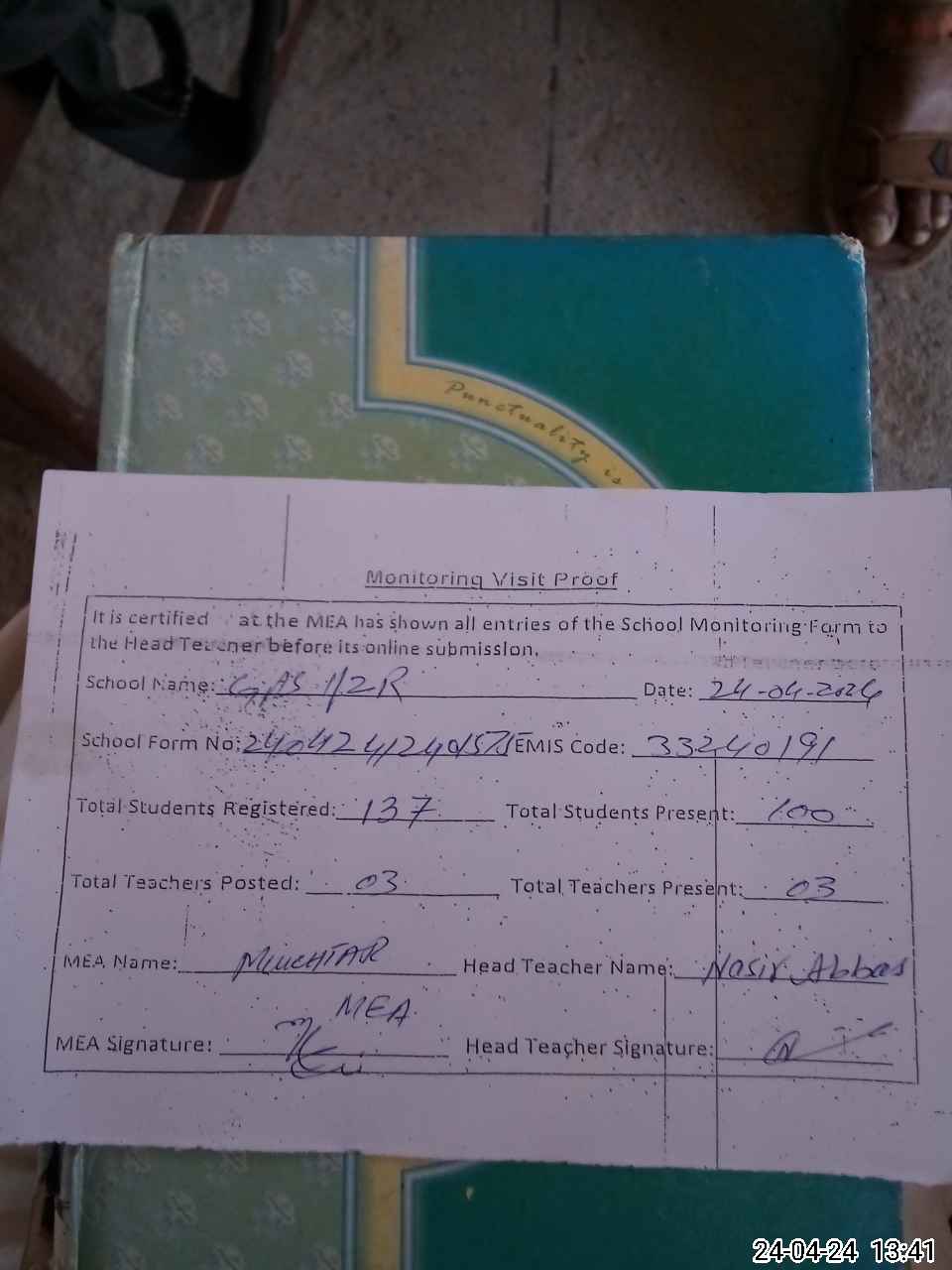 | Attendance Register | Head Teacher | MEA with School | Visit Proof |
