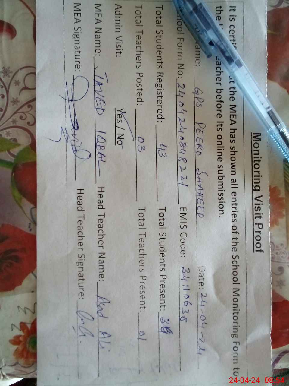 | Attendance Register | Head Teacher | MEA with School | Visit Proof |