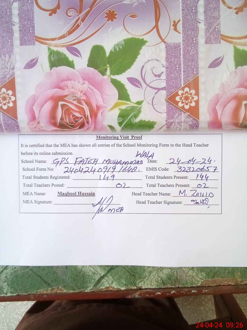 | EMIS Code: 32320657 | Name of School: GPS FATEH MUHAMMAD WALA | |||