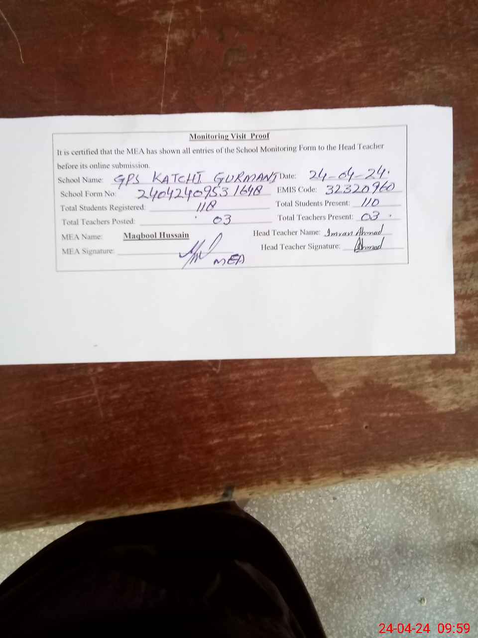 | Attendance Register | Head Teacher | MEA with School | Visit Proof |