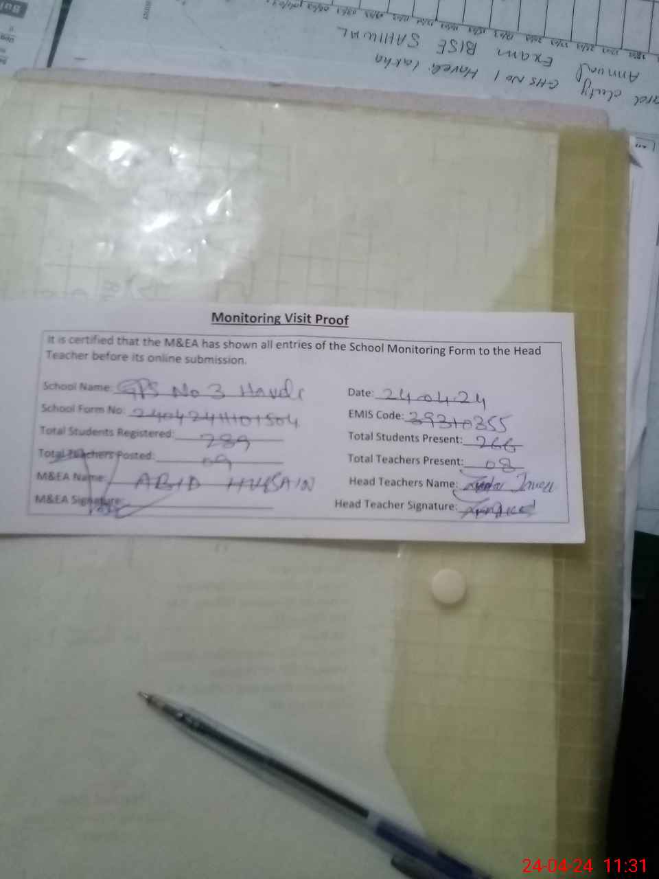 | Attendance Register | Head Teacher | MEA with School | Visit Proof |