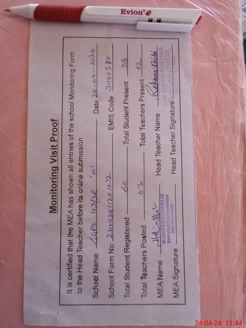 | Attendance Register | Head Teacher | MEA with School | Visit Proof |