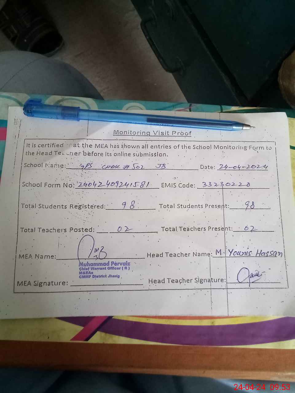 | EMIS Code: 33230220 | Name of School: GPS CHAK NO 502 JB | |||
