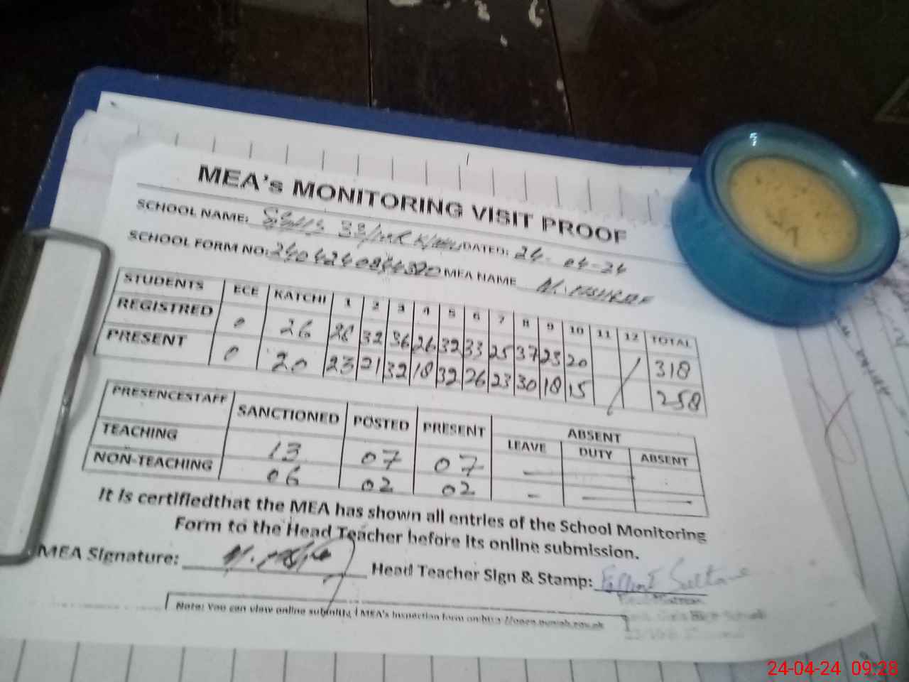 | Attendance Register | Head Teacher | MEA with School | Visit Proof |