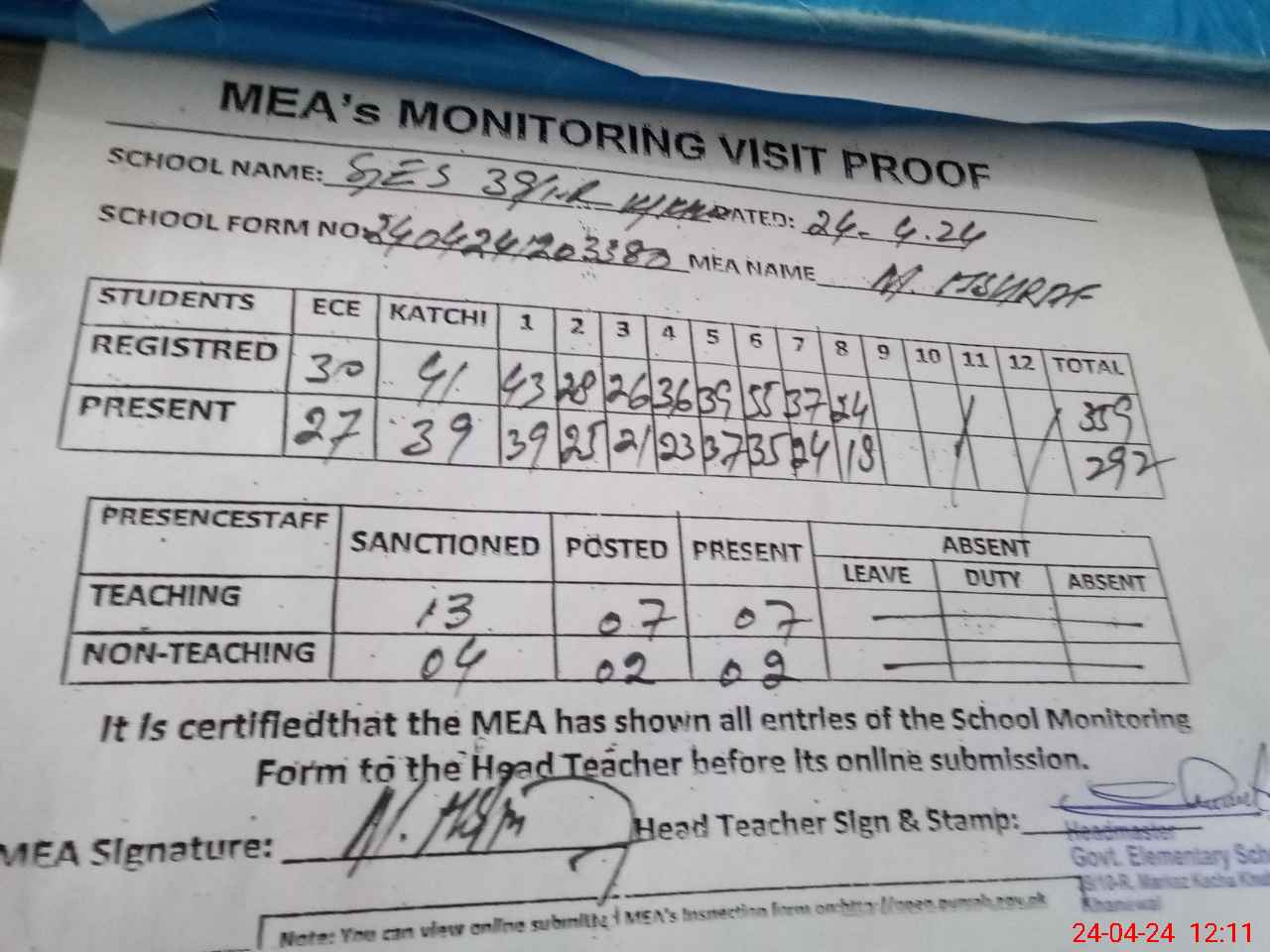 | Attendance Register | Head Teacher | MEA with School | Visit Proof |
