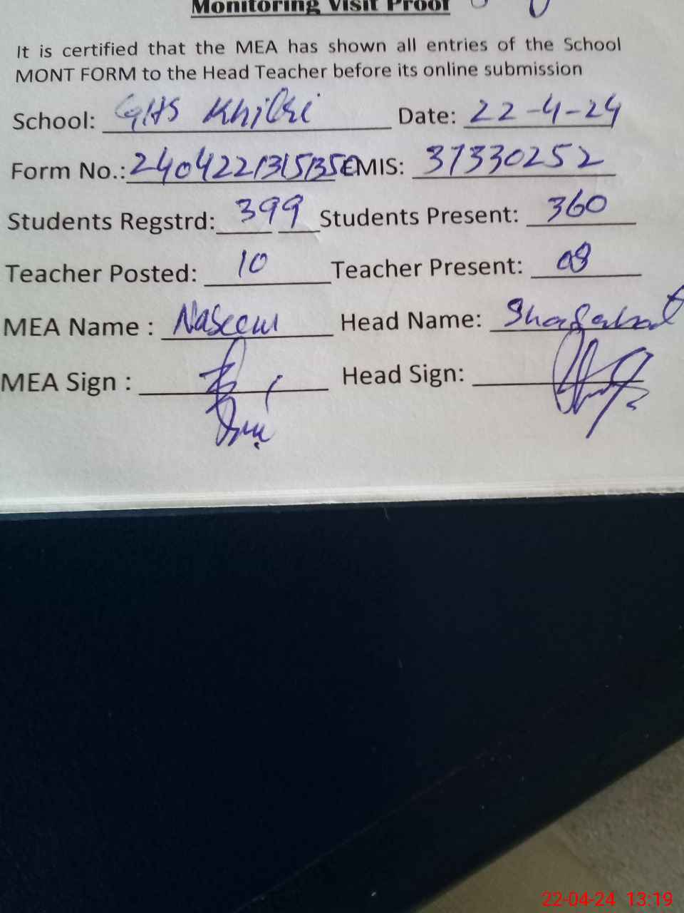 | Certified that this School was Inspected by the Undersigned MEA/DMO Today and the Information Stated Above is as Per Record. | |||||