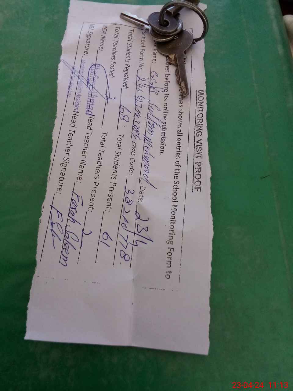 | Attendance Register | Head Teacher | MEA with School | Visit Proof |