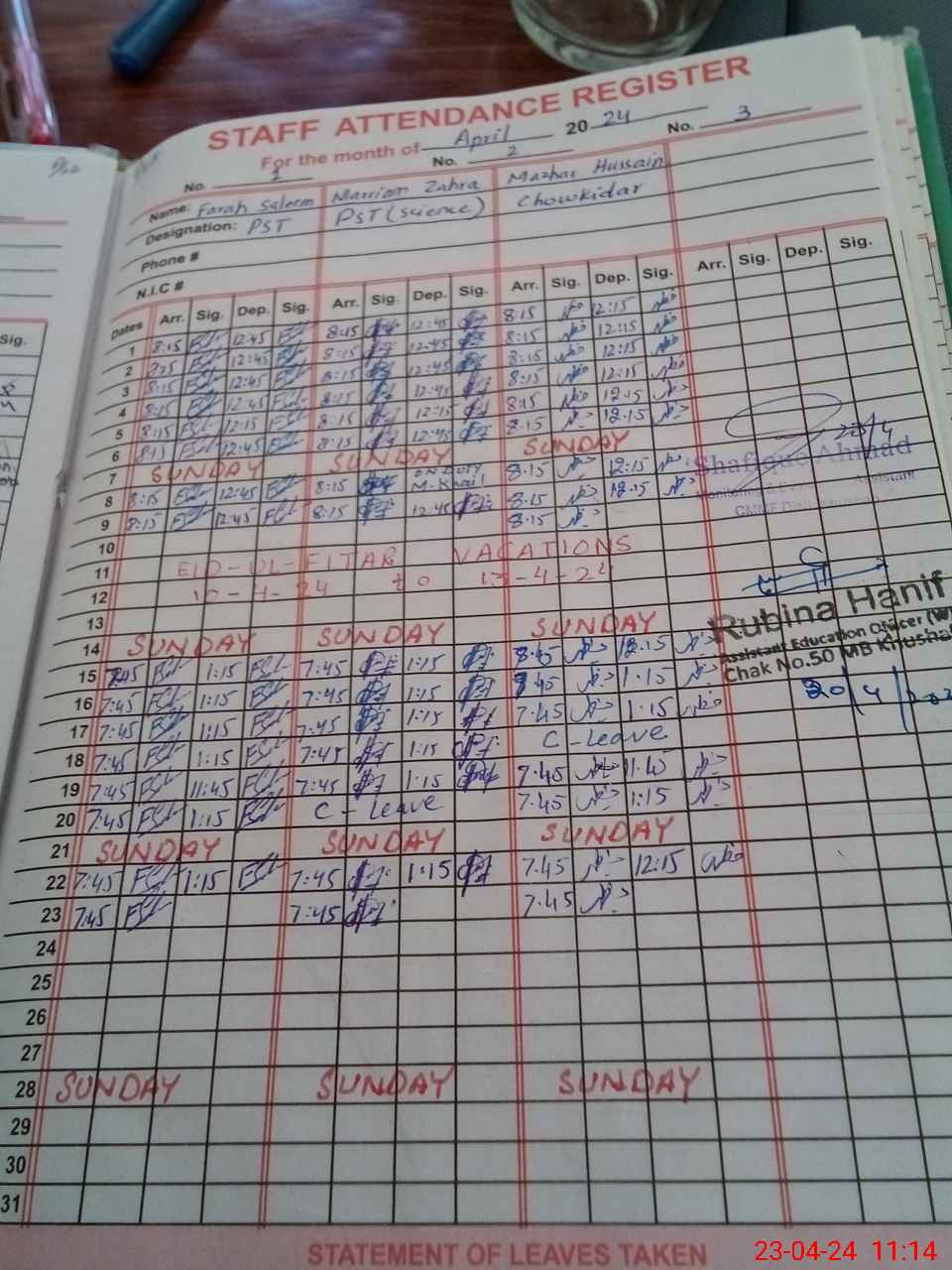 | CNIC | Full Name | Designation | R/C | Absence During Last Calender Month |