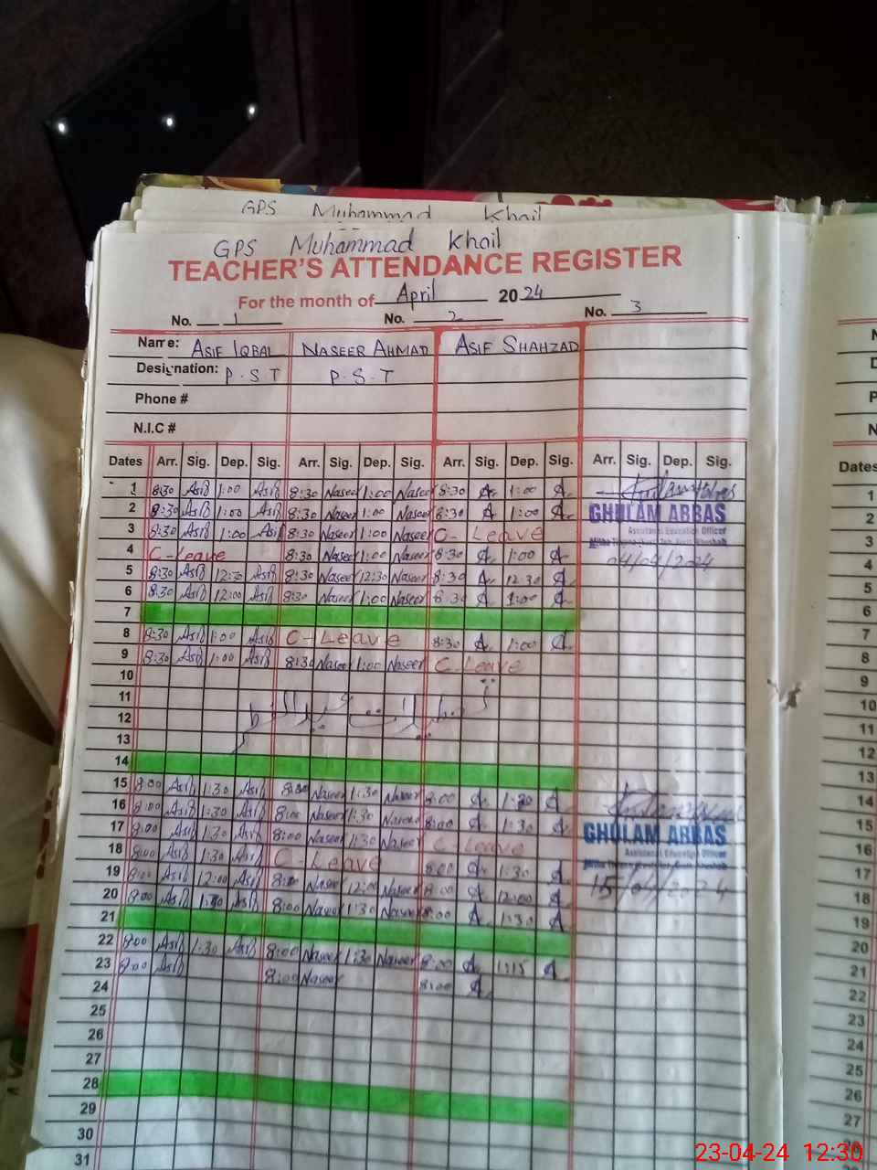| CNIC | Full Name | Designation | R/C | Absence During Last Calender Month |