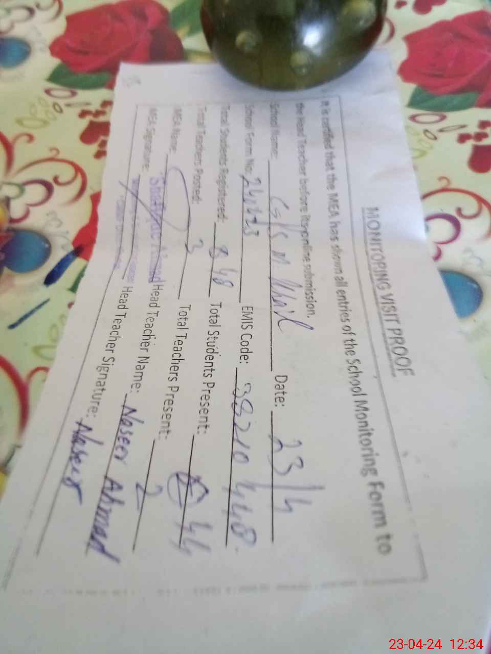 | Attendance Register | Head Teacher | MEA with School | Visit Proof |
