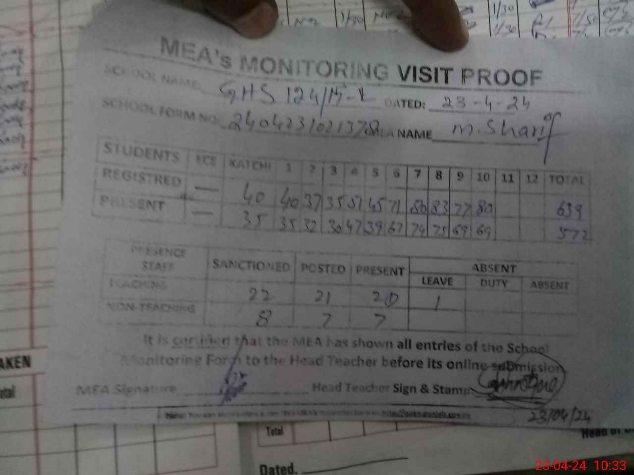| Attendance Register | Head Teacher | MEA with School | Visit Proof |