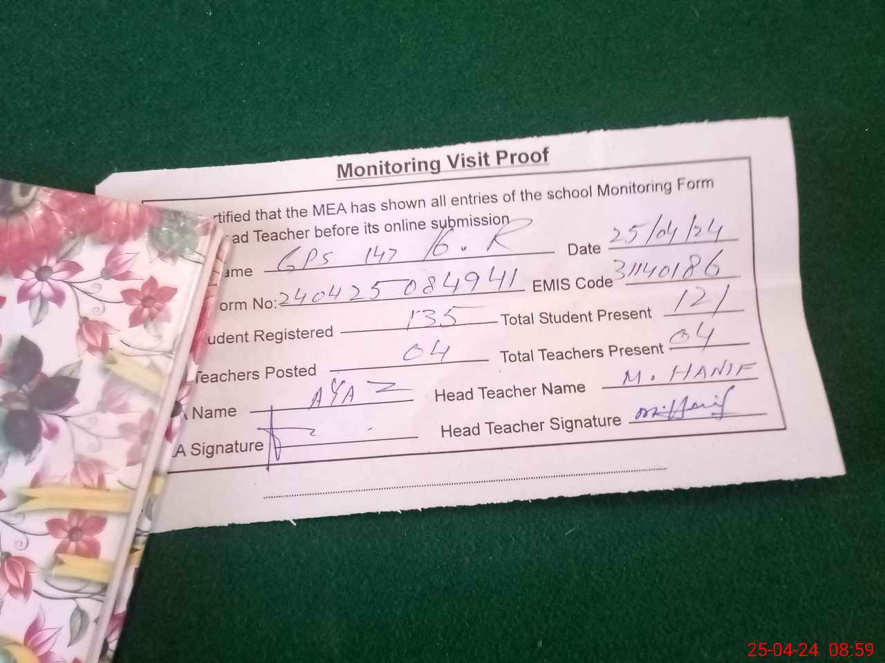 | Attendance Register | Head Teacher | MEA with School | Visit Proof |