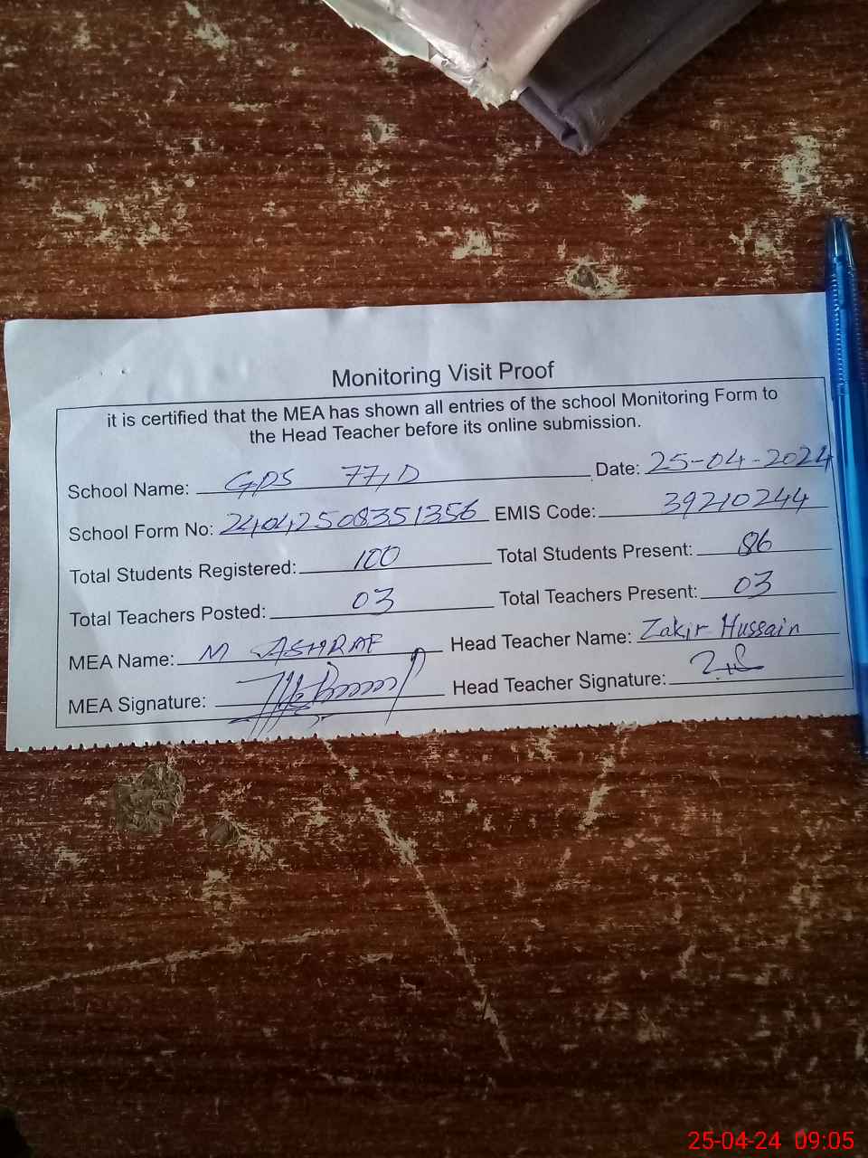 | Attendance Register | Head Teacher | MEA with School | Visit Proof |