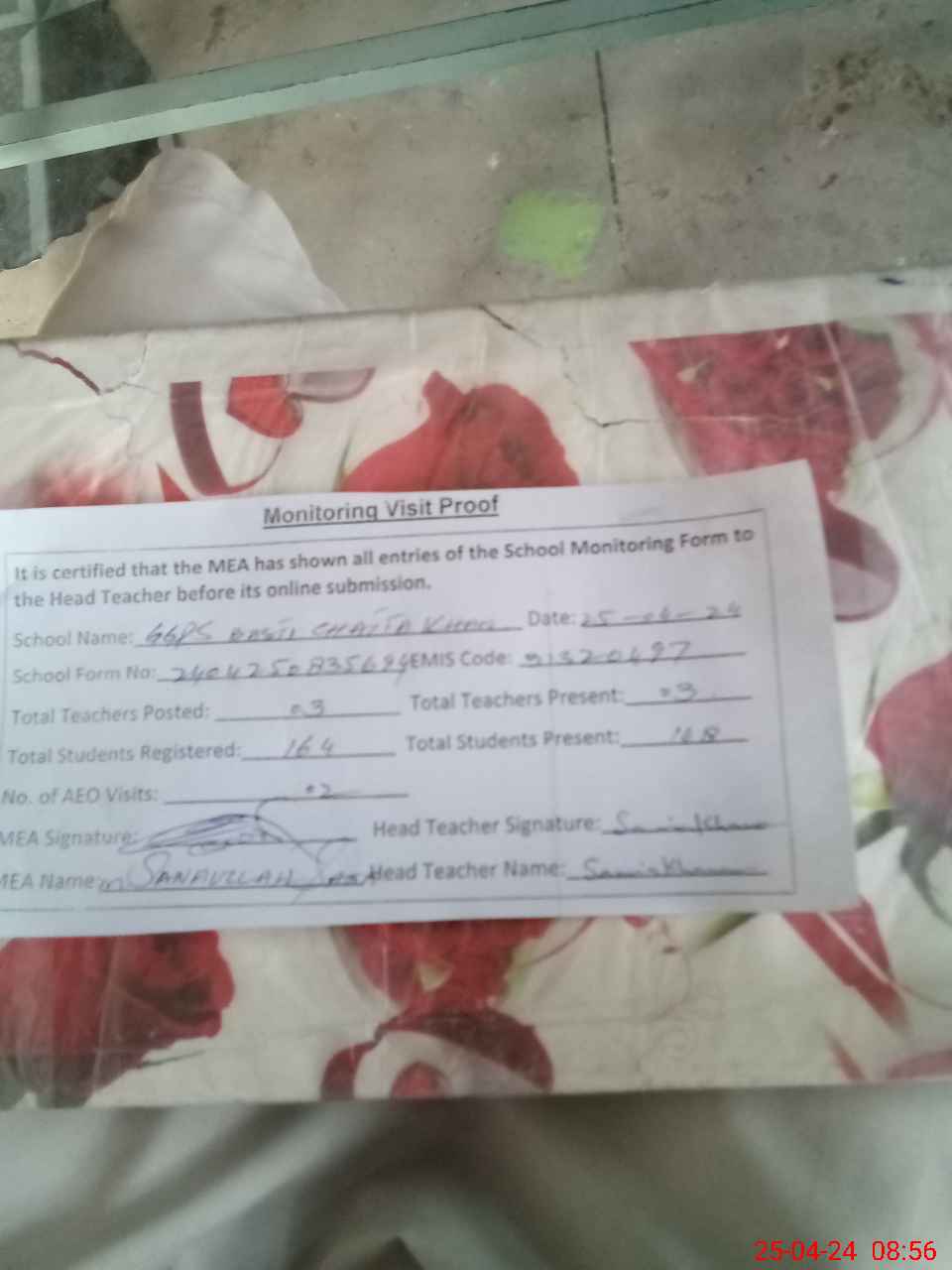 | Attendance Register | Head Teacher | MEA with School | Visit Proof |