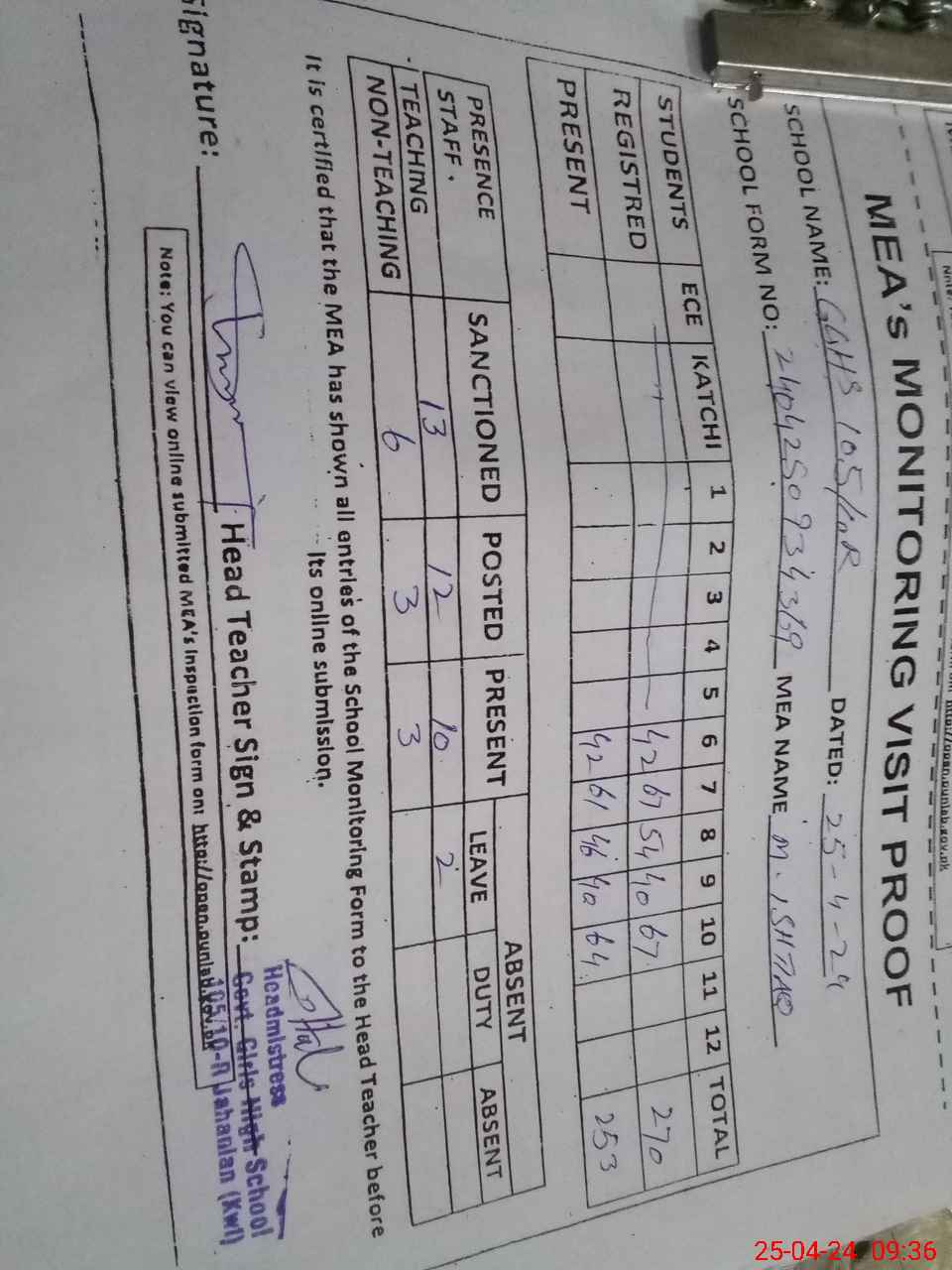 | Attendance Register | Head Teacher | MEA with School | Visit Proof |