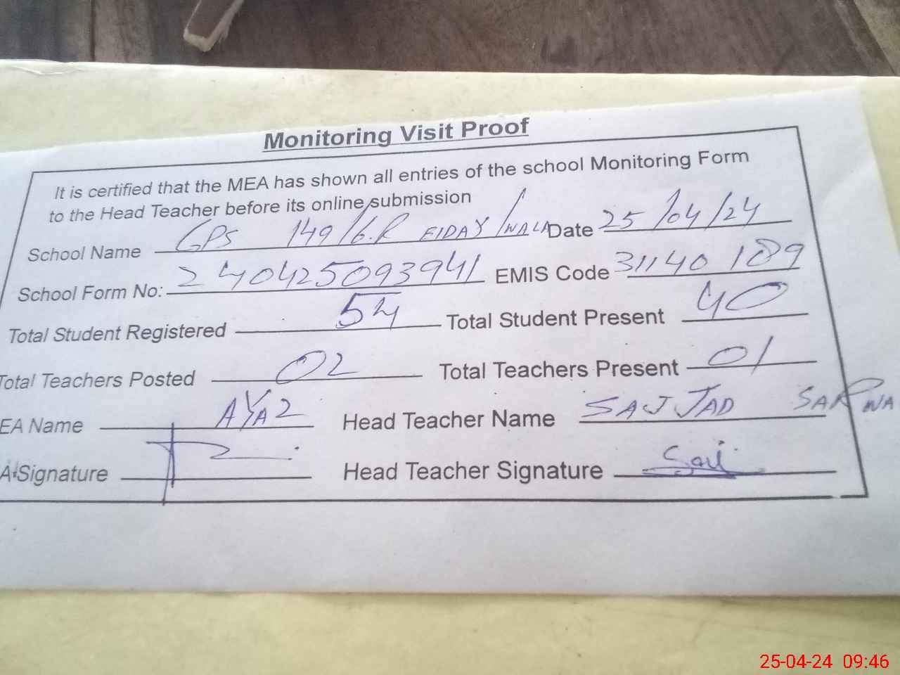 | Attendance Register | Head Teacher | MEA with School | Visit Proof |
