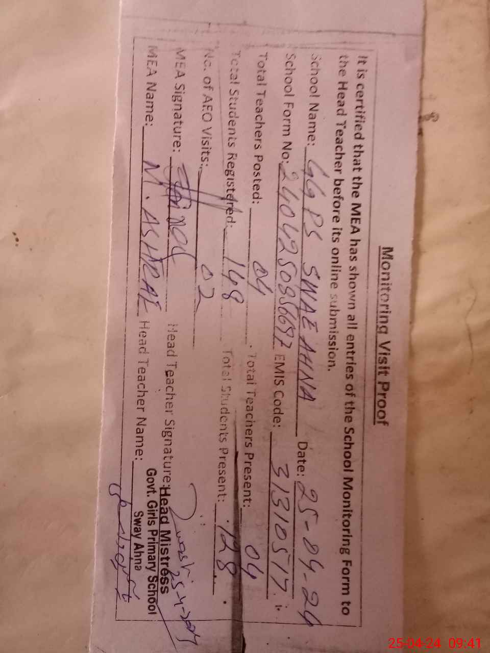 | Attendance Register | Head Teacher | MEA with School | Visit Proof |