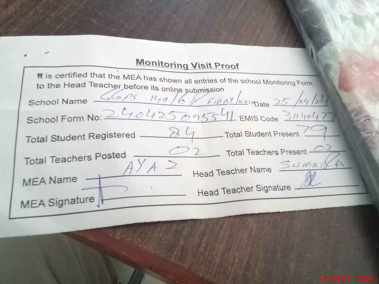 | Attendance Register | Head Teacher | MEA with School | Visit Proof |